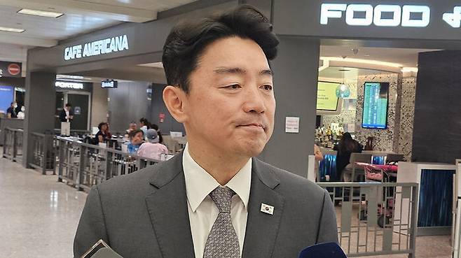 ▲ 강훈식 대통령 비서실장이 24일(현지시간) 워싱턴 DC 인근 덜레스 국제공항에 도착해 질문에 답하고 있다.
