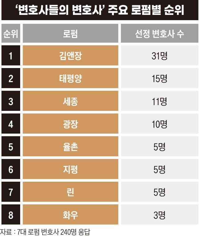 설문은 총 240명의 유효 응답(김앤장 법률사무소, 법무법인 광장, 법무법인 태평양, 법무법인 율촌, 법무법인 세종, 법무법인 화우, 법무법인 지평 소속 변호사)을 받았다. 이름과 소속이 불명확하거나 응답자와 같은 로펌에 재직 중인 변호사를 꼽은 답변은 제외했다.