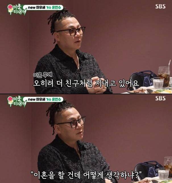 가수 윤민수가 전처와 이혼 후에도 같이 살고 있다고 밝혔다. 이혼 후에도 여전히 친구처럼 가족 여행도 다녀왔다고 말했다.