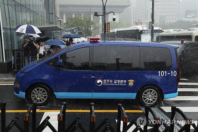 (서울=연합뉴스) 김성민 기자 = 건진법사 전성배 씨가 탑승한 호송차가 25일 김 여사 관련 의혹들을 수사하는 민중기 특별검사팀 사무실이 마련된 서울 종로구 KT광화문빌딩으로 들어가고 있다. 2025.8.25