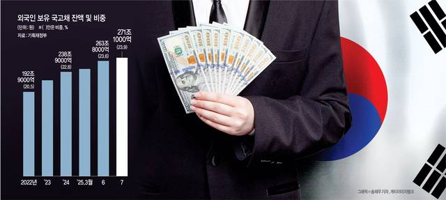 하지만 국가채무 증가와 이재명 정부의 확장 재정 기조로 향후 국채 발행이 더 늘 수 있다는 점에 비춰 외국인 비중 확대가 불안 요소가 될 수 있다는 우려가 고개를 든다.