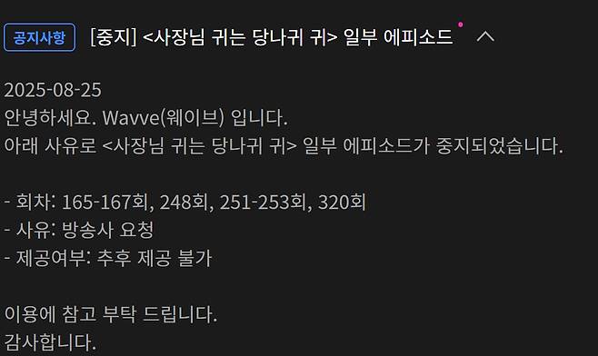 25일 웨이브 측은 KBS 2TV '사장님 귀는 당나귀 귀'(이하 '사당귀') 일부 에피소드의 다시보기 서비스를 중단한다고 알렸다.