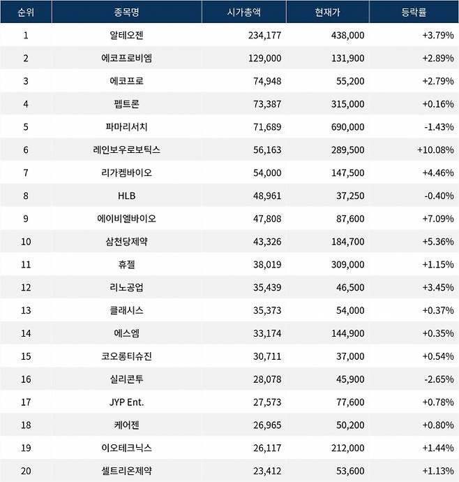한국거래소에 따르면, 시가총액 1위 알테오젠(액면가 500원)은 현재가 438,000원으로 전 거래일 대비 3.79% 상승했다.
