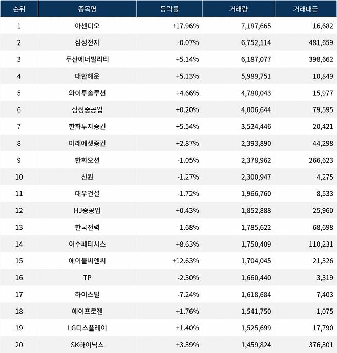 한편 거래량 상위 20위권 종목들은 대우건설(047040) ▼1.72%, HJ중공업(097230) ▲0.43%, 한국전력(015760) ▼1.68%, 이수페타시스(007660) ▲8.63%, 에이블씨엔씨(078520) ▲12.63%, TP(007980) ▼2.30%, 하이스틸(071090) ▼7.24%, 에이프로젠(007460) ▲1.76%, LG디스플레이(034220) ▲1.40%, SK하이닉스(000660) ▲3.39% 등의 성적을 기록하고 있다.