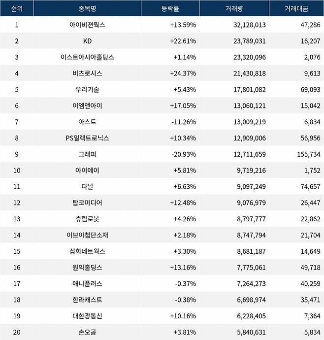 한편 거래량 상위 20위권 종목들은 다날(064260) ▲6.63%, 탑코미디어(134580) ▲12.48%, 휴림로봇(090710) ▲4.26%, 이브이첨단소재(131400) ▲2.18%, 삼화네트웍스(046390) ▲3.30%, 원익홀딩스(030530) ▲13.16%, 애니플러스(310200) ▼0.37%, 한라캐스트(125490) ▼0.38%, 대한광통신(010170) ▲10.16%, 손오공(066910) ▲3.81% 등의 성적을 기록했다.
