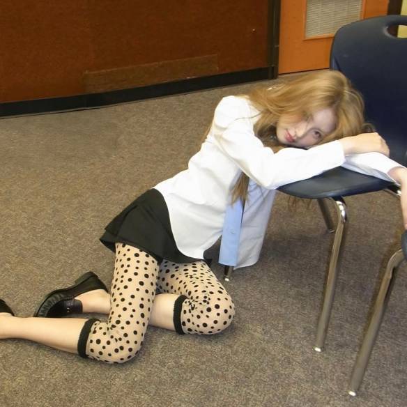 같은 키키 멤버 지유도 선보였던 스타일링. 지유는 도트 패턴의 티셔츠와 도트 프릴 스커트에 레이스 레깅스를 레이어드해 2000년대 하이틴 매거진 감성을 제대로 소화해냈습니다.