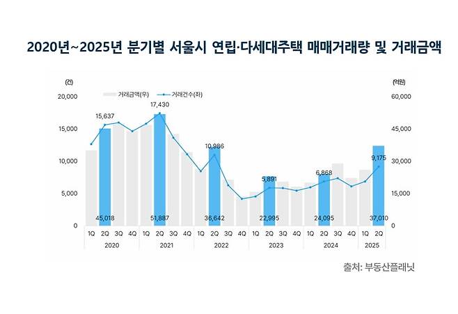 25일 프롭테크 기업 부동산플래닛에 따르면 올해 2분기 서울 연립·다세대주택 매매 거래량이 9175건으로 전년 동기(6868건) 대비 34%가량 증가한 것으로 나타났다. 거래액은 54% 늘어난 3조7010억원을 기록했다. 거래액과 거래량 모두 증가세를 보였다.