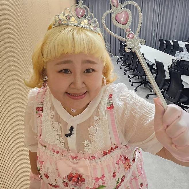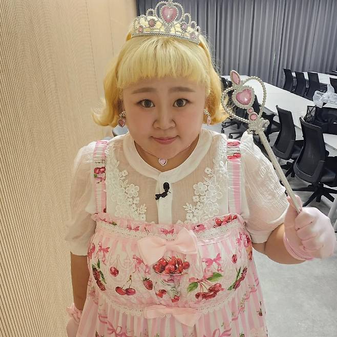 만화 속에서 튀어나온 듯 화려한 핑크 원피스에 핑크 보석이 박힌 왕관과 귀걸이, 목걸이를 착용, 여기에 요술봉까지 들고 완벽한 핑크 공주로 변신한 홍윤화.