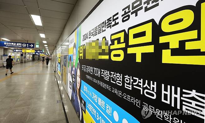 (서울=연합뉴스) 이진욱 기자 = 올해 공무원 시험을 준비하는 청년이 4년 새 반토막이 돼 관련 통계 집계 이래 가장 적었다. 25일 통계청 국가통계포털과 경제활동인구조사 청년층 부가조사에 따르면 올해 5월 기준 20∼34세 비경제활동인구 가운데 지난 1주간 7급·9급 등 '일반직 공무원'(경찰·소방·군무원 포함)을 준비한 청년은 12만9천명으로 작년보다 3만명 감소했다. 일반직 공무원을 준비한 청년은 4년 연속 줄어서 올해는 2017년 관련 통계 집계 이래 최소치를 나타냈다. 사진은 이날 서울 노량진역 승강장에 설치된 한 학원 광고판 모습. 2025.8.25