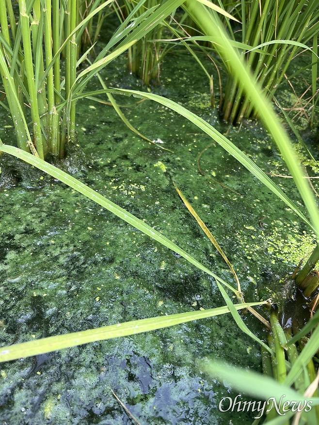 | ▲ 낙동강에서 발생한 녹조가 섞인 물이 인근 논에 그대로 흘러 들어가 있다. |
