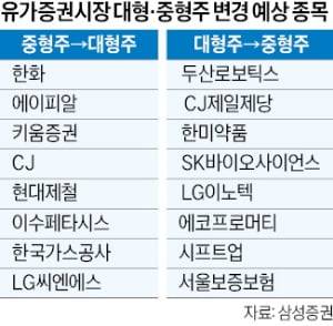 반면 시프트업은 대형주에서 이탈할 가능성이 제기된다. 중국 시장 부진 등으로 2분기 실적이 기대에 못 미치면서 주가가 하락세다. 시총은 지난해 7월 상장 당시 4조원에서 현재 2조4600억원으로 줄었다. 유가증권시장 시총 순위도 150위까지 밀려났다. CJ제일제당, 한미약품, LG이노텍, 에코프로머티 등도 시총 100위권 밖으로 밀려나며 편출 종목으로 거론되고 있다. 달바글로벌은 중형주로 새롭게 편입될 것으로 전망된다. 최근 3개월간 주가는 23% 넘게 올랐지만 보호예수 해제 물량에 대한 우려로 상승 여력이 제한적이라는 평가도 있다.
