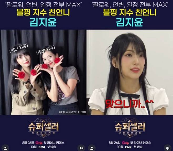지수의 친언니 김지윤은 최근 개인 SNS에 ENA 새 예능 '슈퍼셀러: 인센트브 게임' 출연진 소개 영상을 공유, "드디어 열심히 공부한 이유를 말씀드릴 수 있네요. 저에게 자신감과 좋은 조언 주신 주변 많은 분들 너무 감사드려요! 10월 ENA에서 첫 방송 예정이니까요, 많은 관심과 응원 부탁드릴게요!"라고 전했다.