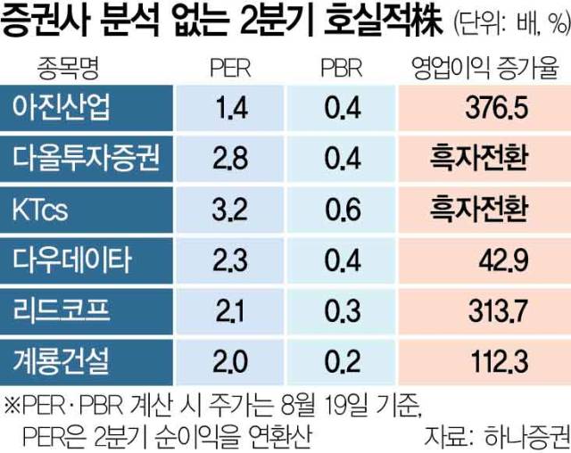 국내 증시가 뚜렷한 방향성 없이 혼조세를 이어가는 가운데 증권사 실적 전망치(컨센서스)조차 없는 중소형주 중 괄목할 만한 실적 개선을 이뤄낸 종목을 발굴하는 방안도 효과적이라는 분석이 나왔다. 2분기 실적을 바탕으로 추려낸 저평가 가치주에 추후 기관투자가 혹은 고액 자산가들의 자금이 유입될 가능성에 베팅하는 것이다.
