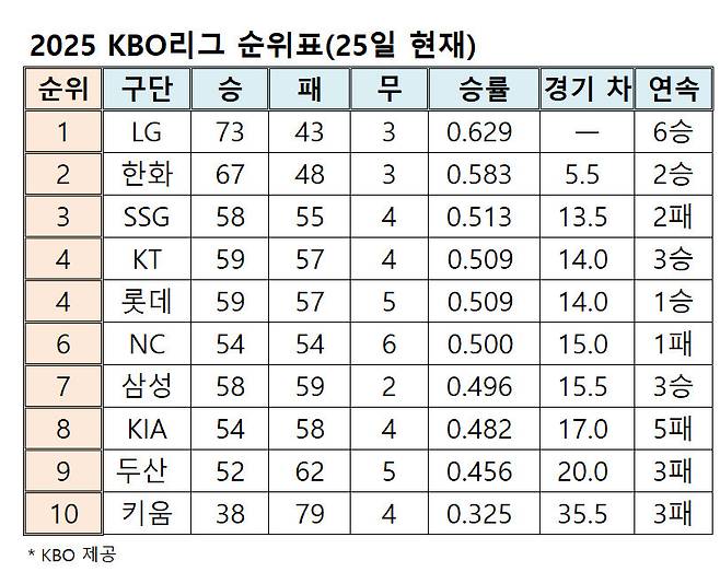 2025 KBO리그 정규리그가 막바지에 접어들었다. 25일까지 592경기를 소화(82.2%)해서 잔여 경기는 20%(128경기)도 채 되지 않는다. 시즌은 끝을 향해 달려가고 있지만 순위 판은 여전히 요동친다. 3위 에스에스지(SSG) 랜더스와 7위 삼성 라이온즈의 경기 차가 2경기에 불과하다. ‘1000만 관중’을 동원한 흥행 요소는 여전히 현재진행형이다.