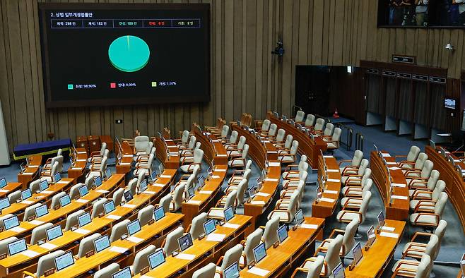 | 표결 보이콧… 텅 빈 국힘 의원석 25일 서울 여의도 국회 본회의에서 국민의힘 의원들이 불참한 가운데 재석 의원 182명 중 찬성 180명, 기권 2명으로 상법 일부개정법률안이 통과됐다. 최상수 기자 |