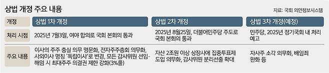 더불어민주당은 지난달에 이어 두 차례 연속으로 개정을 이끌어내며, 이번에는 '자사주 소각 의무화'를 겨냥한 3차 개정까지 예고했다.