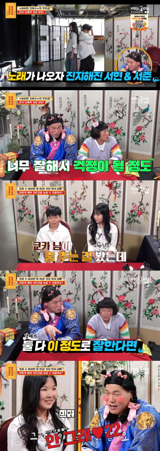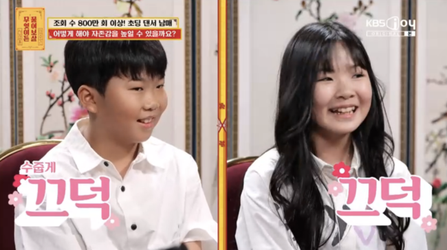 25일 방송된 KBS JOY '무엇이든 물어보살'에서 6학년 배서현, 5학년 배서준 남매가 등장했다. "학교에서 춤 춘 영상이 유튜브 조회수 600만이 넘었다"는 이들은 엄청난 춤 실력을 뽐내 서장훈과 이수근을 깜짝 놀라게 했다.
