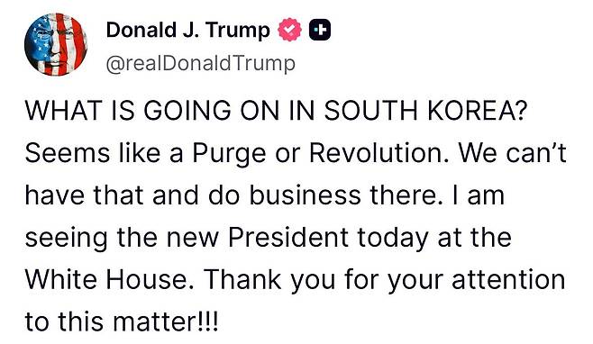 트럼프 대통령은 이날 트루스소셜에 올린 글에서 "한국에서 무슨 일이 일어나고 있는 것인가"라며 "숙청 또는 혁명같이 보인다"라고 썼다. 이어 "우리는 그것을 수용할 수 없고, 거기서 사업할 수 없다"고 덧붙였다.