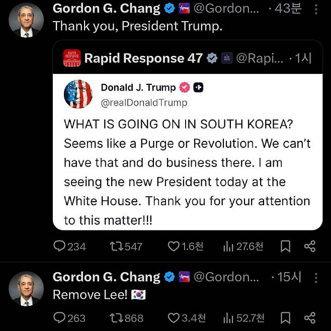 고든 창은 이어 "이재명을 제거하자(Remove Lee!)"라고 썼다.