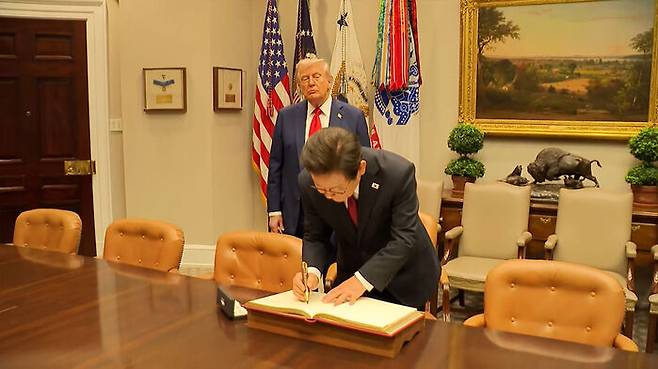 방명록 서명 보던 트럼프 '돌발 요청'…이 대통령 "영광"