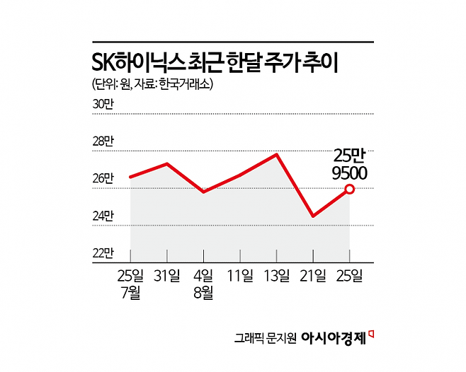 SK하이닉스 주가는 지난달 30만원을 찍은 후 지지부진한 흐름을 보여왔다. 고대역폭메모리(HBM) 시장 점유율 변화에 따른 내년 실적 우려가 영향을 미쳤고 최근에는 AI 거품설이 제기되며 엔비디아가 큰 폭으로 하락하자 SK하이닉스도 큰 폭의 하락세를 보인 바 있다. 증권가에서는 내년까지 SK하이닉스의 지배적 점유율이 유지될 것이란 전망이 나온다. 손인준 흥국증권 연구원은 "내년 HBM 공급 계약의 불확실성으로 인해 공급업체 간 경쟁 심화 우려가 지속되고 있고, 이는 시장점유율 구도 변화에 따른 SK하이닉스의 2026년 실적 우려로 이어지고 있다"면서 "올해 대비 점유율 축소는 예상되나 그 폭은 크지 않을 것으로 보이며 SK하이닉스가 내년에도 HBM 시장에서 지배적 점유율을 유지함과 동시에 강력한 AI 수요의 수혜를 입을 것"이라고 내다봤다.