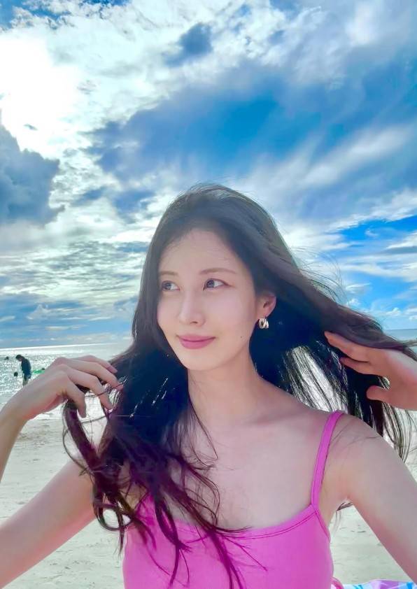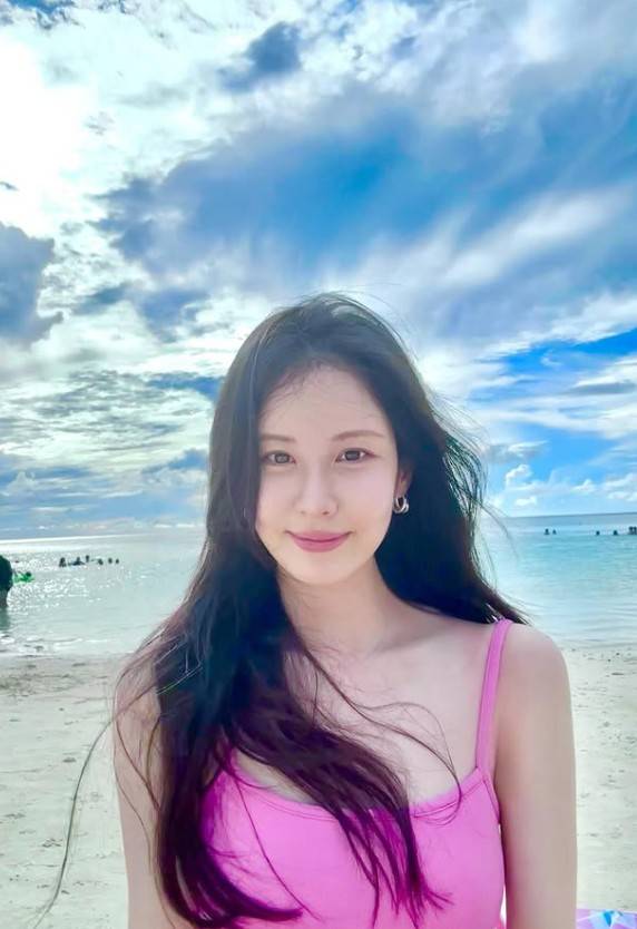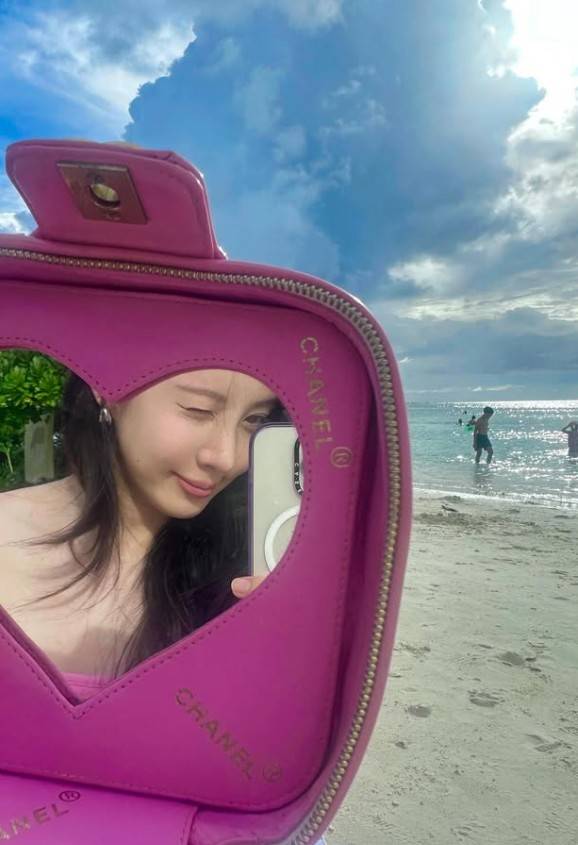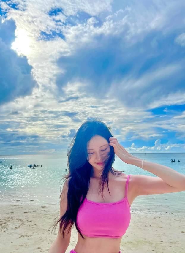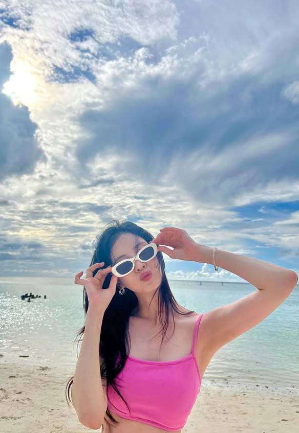 화이트 프레임의 캣아이 선글라스는 복고적인 감성을 더하며 전체적인 스타일에 리듬을 부여했고, 자연스러운 웨이브 롱 헤어는 해변 특유의 자유로운 분위기와 어우러지며 감각적인 연출을 완성했다. 메이크업은 베이스 중심의 투명한 피부 표현과 핑크빛 립 조합으로 청순한 무드를 극대화했다.