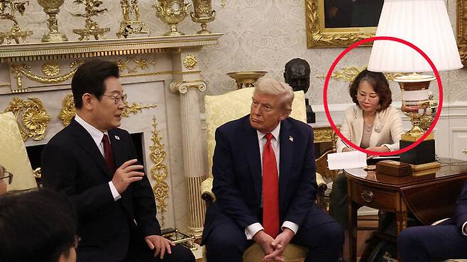 ▲ 25일 미국 백악관에서 열린 한미 정상회담에서 이연향 국무부 국장(빨간 원)이 도널드 트럼프 미 대통령(가운데)의 영어를 한국어로 통역을 하고 있다.