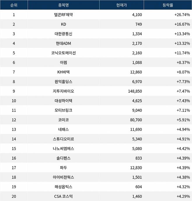6위 이렘(009730)은 현재가 1,088원으로 8.37% 상승 중이다. 7위 KH바텍(060720)은 현재가 12,860원으로 8.07% 상승 중이다. 8위 원익홀딩스(030530)는 현재가 6,970원으로 7.73% 상승 중이다. 9위 지투지바이오(456160)는 현재가 148,850원으로 7.47% 상승 중이다. 10위 대성하이텍(129920)은 현재가 4,625원으로 7.43% 상승 중이다.