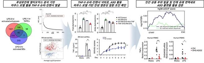 연구팀은 멀티오믹스 분석을 통해 면역세포 내 62개의 염증 관련 슈퍼-인핸서를 규명했고 이 가운데 TNFα를 핵심적으로 조절하는 ‘TNF-9 슈퍼-인핸서’를 찾아냈다. 이어 이 부위에서 생성되는 eRNA를 억제하거나 제거하자 TNFα 분비가 줄면서 쥐의 관절염과 건선 증상이 완화되는 것을 확인했다.