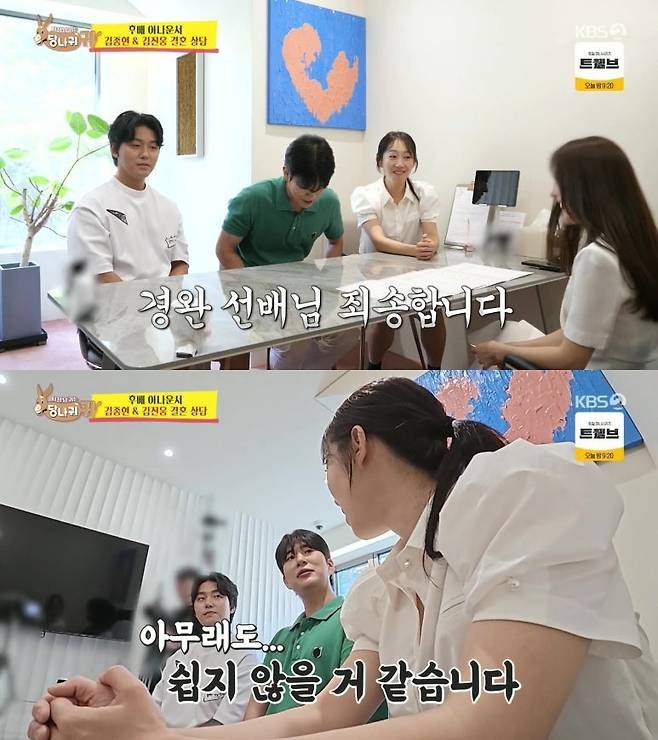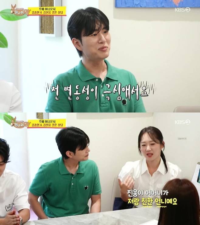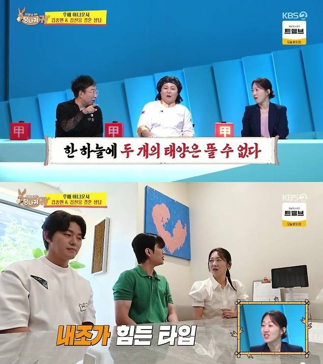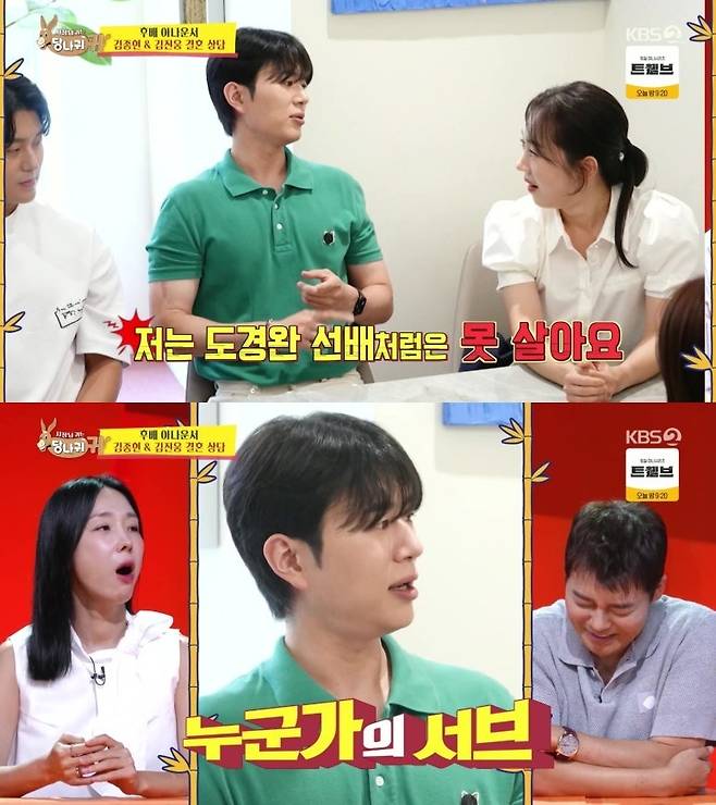 그런데 이 과정에서 김진웅 아나운서의 발언이 도마 위에 올랐다. 김 아나운서는 상담 직원과의 대화 도중 도경완 아나운서와 가수 장윤정 부부를 언급하면서 "난 도경완 선배처럼 못 산다. 결례일 수 있지만 누군가의 서브로는 못 살겠다"라고 언급해 보는 이들을 놀라게 만들었다.