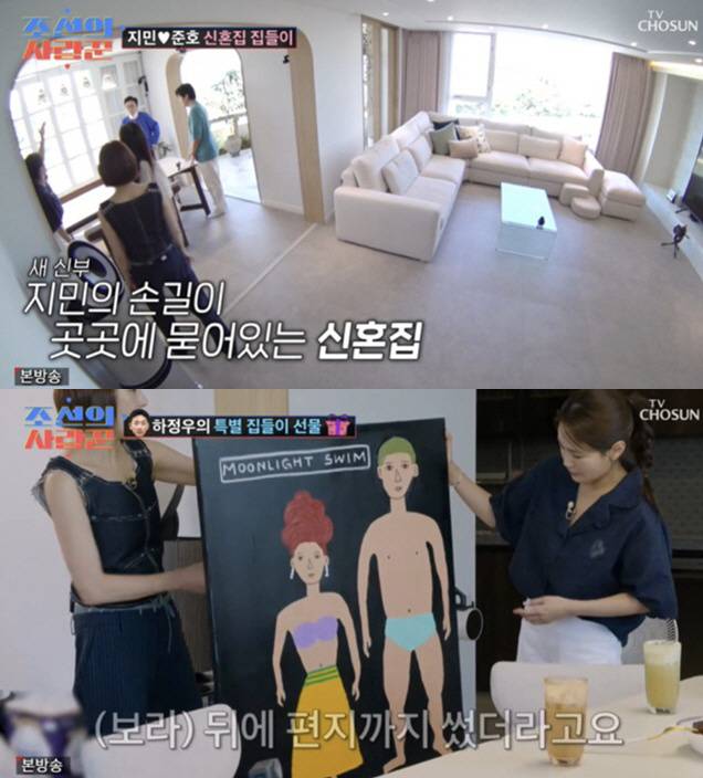 앞서 김지민은 '조선의 사랑꾼' MC들을 초대해 집들이를 했는데, 이때 절친 황보라가 아주버님이자 동료 배우인 하정우가 그린 그림을 선물해 화제를 모았다.