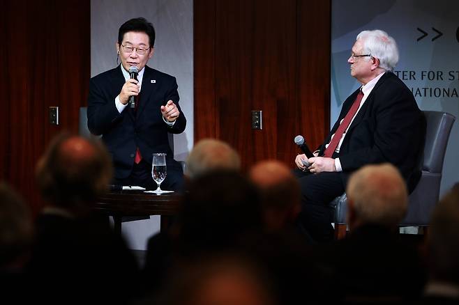 | ▲ 이재명 대통령이 25일(현지 시각) 미국 워싱턴DC 전략국제문제연구소(CSIS)에서 정책 연설 뒤 존 햄리 CSIS 소장의 질문에 답하고 있다. 2025.8.26 |