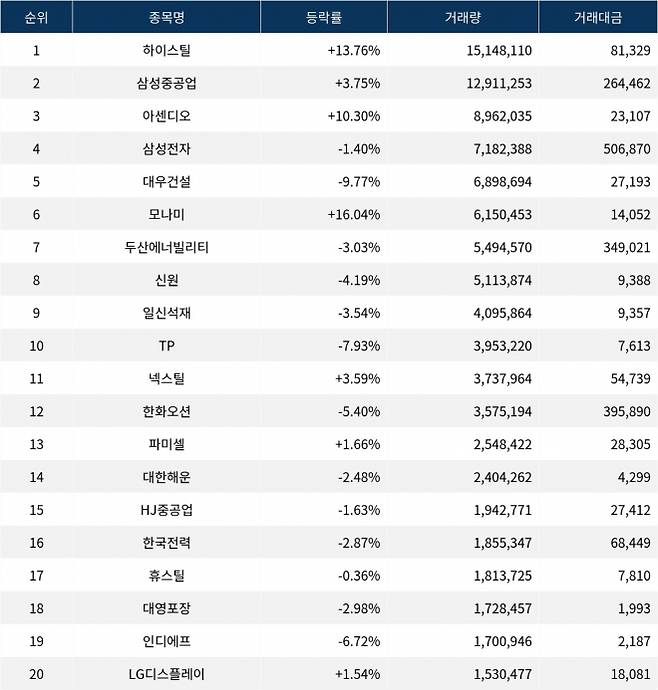한편 거래량 상위 20위권 종목들은 넥스틸(092790) ▲3.59%, 한화오션(042660) ▼5.40%, 파미셀(005690) ▲1.66%, 대한해운(005880) ▼2.48%, HJ중공업(097230) ▼1.63%, 한국전력(015760) ▼2.87%, 휴스틸(005010) ▼0.36%, 대영포장(014160) ▼2.98%, 인디에프(014990) ▼6.72%, LG디스플레이(034220) ▲1.54% 등의 성적을 기록하고 있다.