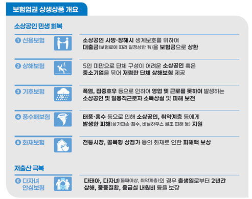 보험업권 상생 상품으로는 소상공인 민생 회복, 중소기업 지원, 저출생 극복 등을 효과적으로 지원할 수 있는 상품이 구성됐다. 신용보험은 소상공인이 사망하거나 장해를 입으면 보험금으로 대출을 대신 갚아 가족의 빚 부담을 막아주는 방식이다. 기후보험의 경우, 폭염이나 집중호우로 일을 하지 못한 노동자나 소상공인들의 소득을 보전하는 내용을 담았다. 보험업계는 향후 새로운 상생 보험상품도 지속 개발할 계획이다.