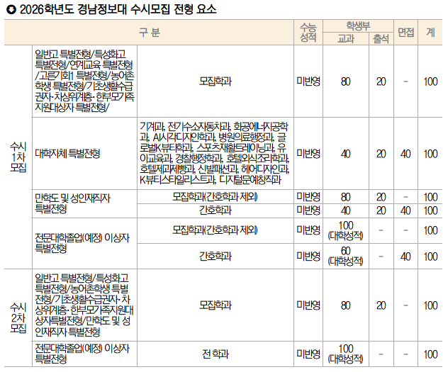 또한 경남정보대는 2026학년도에 △첨단기술학부 △공간디자인학부 △문화콘텐츠학부 △보건의료학부 △커리어개발학부 △관광외식학부 △라이프케어학부 △성인융합학부 등 8개 학부, 35개 학과 체제를 갖췄다.