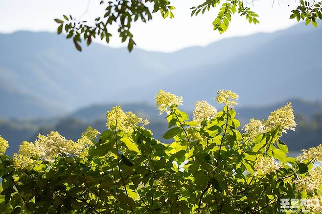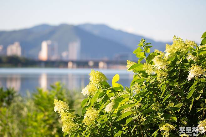 뜨거운 여름을 견뎌내는 강변의 목수국.