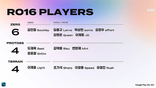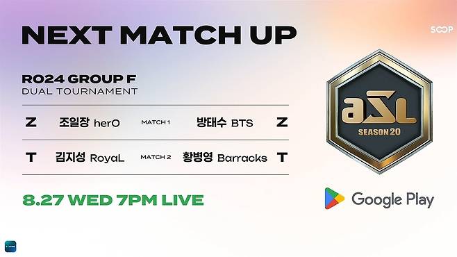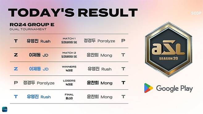 글로벌 라이브 스트리밍 플랫폼 SOOP은 26일 스타크래프트 대회 'Google Play ASL 시즌20' 24강 E조 경기를 진행했다. E조에서는 케이대 이제동, 정선대 정경두, 정선대 유영진, 흑카데미 윤찬희(몽군)이 대진을 이뤘다.