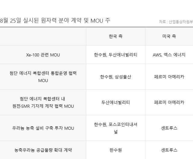 한수원과 두산에너빌리티, 아마존 웹서비스(AWS), 엑스 에너지(X-energy)는 25일(현지시간) 워싱턴DC 윌러드 인터콘티넨탈 호텔에서 업무협약(MOU)을 맺었다. 엑스 에너지는 차세대 SMR인 고온가스로형 원자로 'Xe-100'을 개발했으며 미국 에너지부의 지원하에 상용화를 추진 중이다. AWS는 Xe-100을 상용화해 2039년까지 AWS 인공지능 데이터센터(AIDC)에 5기가와트(GW) 이상의 전력을 공급한다는 계획으로 7억 달러를 투자했다. 그러려면 80메가와트(MW)급인 Xe-100를 64기나 지어야 한다.