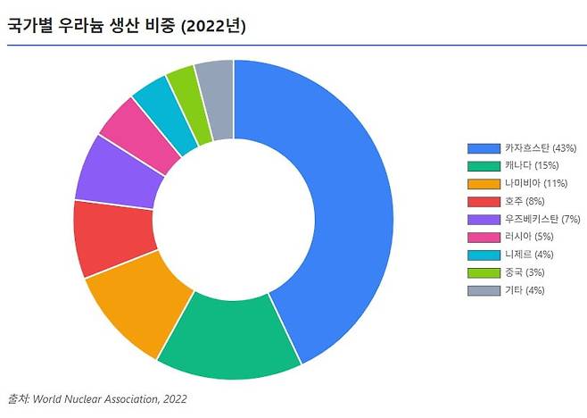 우라늄은 밸류 체인의 가장 앞단부터 특정 지역 쏠림이 심하다. 2022년 기준 우라늄 광산 생산량의 43%를 카자흐스탄이 차지했다. 이어 캐나다(15%), 나미비아(11%) 등 순이다. 카자흐스탄은 2009년 세계 1위 생산국이 된 이후 공급량을 꾸준히 늘려 왔다. 작년에도 증산 계획을 발표하며 1위를 유지하고 있다. 상위 3개국이 전 세계 생산의 70%에 달하는 구조다. 특정 지역 정세 변화나 정책에 따라 우라늄 공급의 변동성이 커질 수밖에 없다.