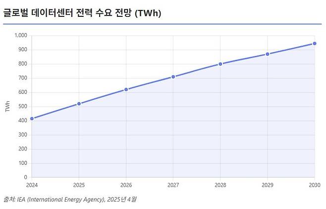 27일 로이터통신에 따르면 국제에너지기구(IEA)는 지난 4월 “향후 5년간 데이터센터 전력 수요가 두 배로 늘어 2030년에는 약 945TWh로 일본 전체 소비량을 넘어서게 될 것”이라 전망했다. 늘어날 전력 수요의 핵심 동인은 인공지능(AI) 확산이다. AI 모델 학습과 서비스에 막대한 전력이 필요하기 때문이다.