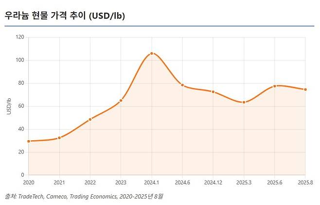 가격 급등의 배경은 공급 차질과 수요 확대 요인이 복합적으로 작용했다. 세계 최대 생산국 카자흐스탄은 2024년~2025년 증산 계획이 황산 부족 등으로 차질을 빚으며 줄였다. 니제르의 불안정으로 일부 공급에 공백 가능성도 생겼다. 여기에 러시아발 제재 리스크로 많은 우라늄 구매자들이 시장 비축과 장기 계약 확보에 나서 수요 측 압력이 커졌다. 우라늄 가격은 2020년대 초까지만 해도 20~30달러대였지만 2022년 러-우 전쟁 이후 1~2년 새 두 배 이상 급등했다.