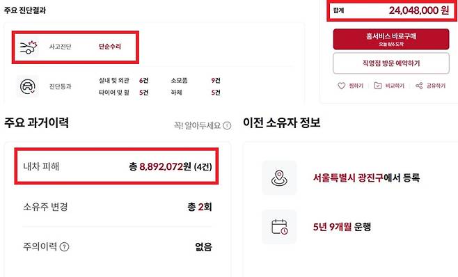 직영 중고차를 표방하는 케이카에서 확인한 매물들도 이 같은 문제를 여과없이 보여준다. 2,070만원에 등록된 독일 M사의 E 차종은 '단순수리'로 표기되어있지만 보험 이력 상 내 차 피해만 4건, 비용은 889만원에 이른다. 법적 기준으로는 단순 수리지만 2,000만원짜리 차에 900만원에 가까운 수리비가 잡혀 있다는 걸 보고 '경미한 수리'라고 이해할 소비자는 적을 테다.