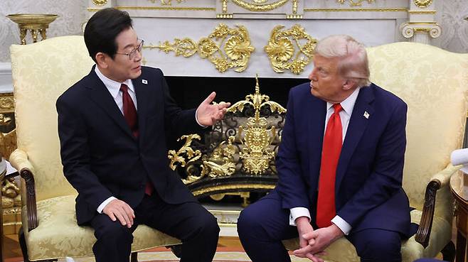 ▲ 이재명 대통령과 도널드 트럼프 미국 대통령이 25일(현지시간) 미국 워싱턴 DC 백악관에서 정상회담을 하고 있다.
