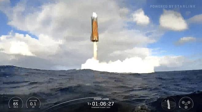 ABC방송 등 현지 매체들에 따르면 스페이스X는 26일 오후 6시 30분(현지시간) 미국 텍사스주 보카치카 해변의 스타베이스 기지에서 ‘슈퍼 헤비’ 로켓에 스타십을 얹어 지구 저궤도를 항해 발사했다. 1단 부스터 역할을 하는 슈퍼 헤비는 비상시 대응 시험 차원에서 계획대로 멕시코만에 착수(着水)했다. 스타십은 순조롭게 지구 저궤도에 진입한 뒤 ‘스타링크’에 쓰이는 위성과 비슷한 모형 위성 8개를 우주 궤도에 뿌렸다. 스타십은 약 66분간의 비행을 마치고 비교적 온전한 형태로 인도양에 착수했다.