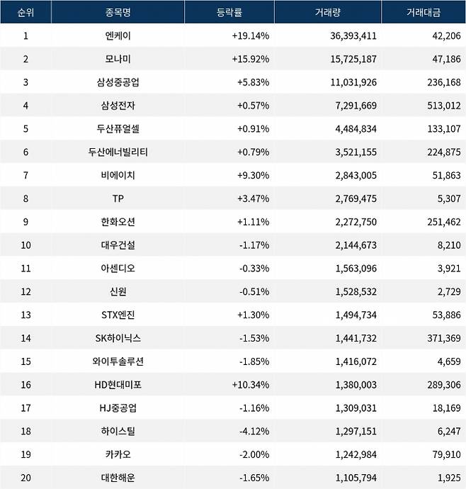 한편 거래량 상위 20위권 종목들은 아센디오(012170) ▼0.33%, 신원(009270) ▼0.51%, STX엔진(077970) ▲1.30%, SK하이닉스(000660) ▼1.53%, 와이투솔루션(011690) ▼1.85%, HD현대미포(010620) ▲10.34%, HJ중공업(097230) ▼1.16%, 하이스틸(071090) ▼4.12%, 카카오(035720) ▼2.00%, 대한해운(005880) ▼1.65% 등의 성적을 기록하고 있다.