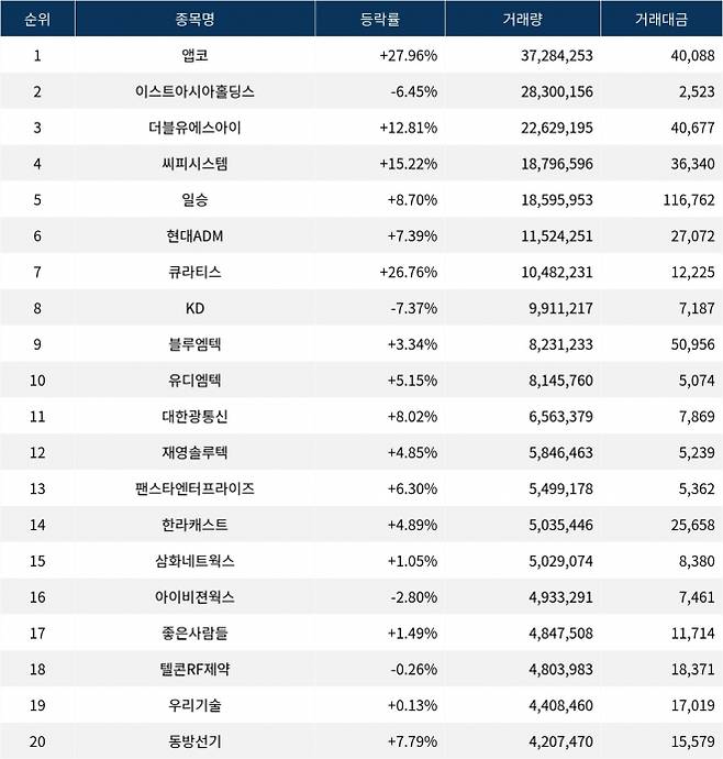 한편 거래량 상위 20위권 종목들은 대한광통신(010170) ▲8.02%, 재영솔루텍(049630) ▲4.85%, 팬스타엔터프라이즈(054300) ▲6.30%, 한라캐스트(125490) ▲4.89%, 삼화네트웍스(046390) ▲1.05%, 아이비젼웍스(469750) ▼2.80%, 좋은사람들(033340) ▲1.49%, 텔콘RF제약(200230) ▼0.26%, 우리기술(032820) ▲0.13%, 동방선기(099410) ▲7.79% 등의 성적을 기록했다.