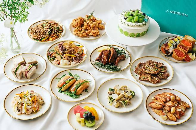 기본 세트는 ▲해산물 샐러드 ▲후토마키 & 유부초밥 ▲소고기 잡채 ▲치킨 가라아게 ▲버펄로 윙 & 칠리소스 ▲LA 갈비 ▲바비큐 폭립 ▲감자 뇨끼 & 트러플 크림소스 ▲훈제 연어 베이글 ▲콘 비프 샌드위치 ▲제철 과일 ▲제철 과일 케이크 등 10여 가지 메뉴로 구성됐다.