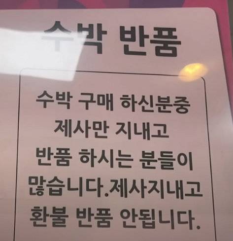이달 부산의 한 대형 마트에는 "수박 구매하신 분들 중 제사만 지내고 반품하시는 분들이 많다"며 "제사지내고 환불·반품 안 된다"는 경고성 메시지가 붙었다.