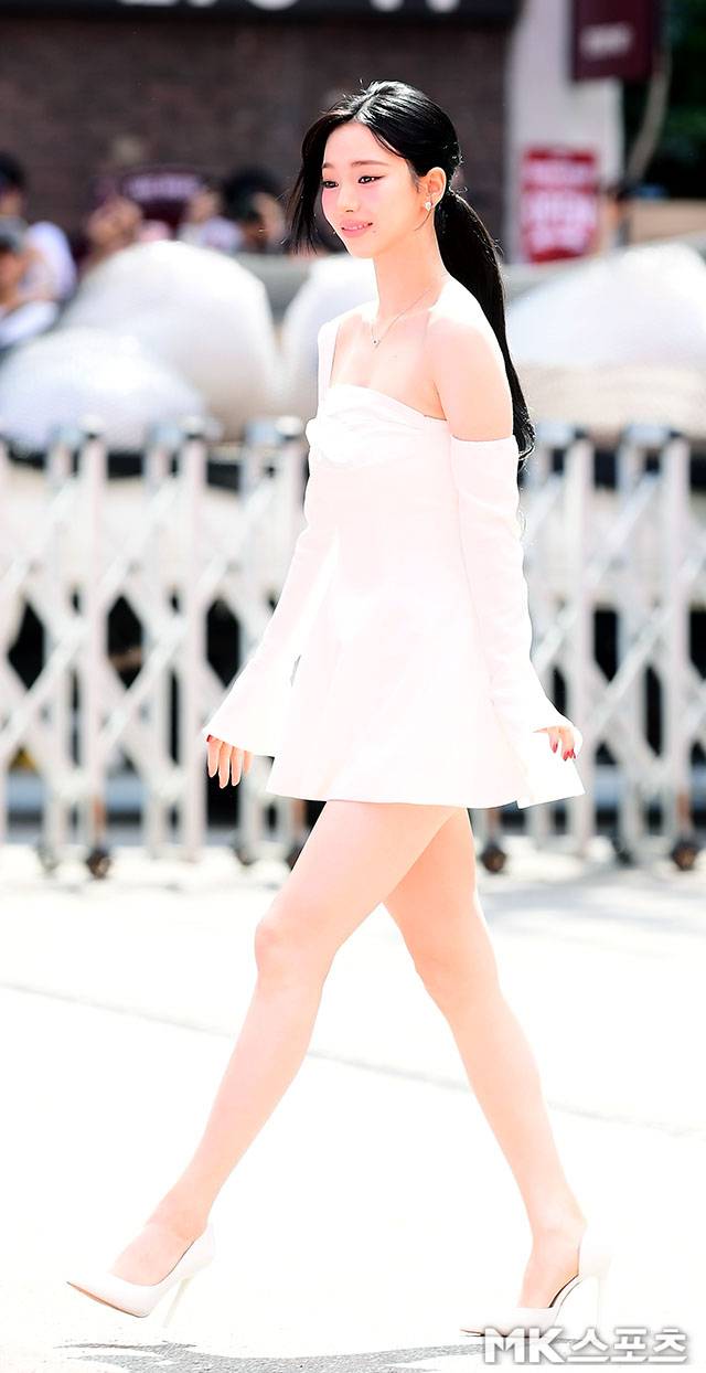 특히 168cm의 큰 키에서 뻗어 내려오는 끝도 없는 다리 라인은 시선을 압도했다. 화이트 스틸레토 힐과의 조합은 전체 실루엣을 길고 슬림하게 완성하며 ‘비율 끝판왕’다운 존재감을 드러냈다.
