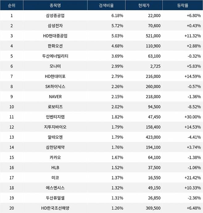 이어 검색비율 2위의 삼성전자(005930)는 0.43% 상승 마감했다. 검색비율 3위의 HD현대중공업(329180)은 11.32% 상승 마감했다. 검색비율 4위 한화오션(042660)은 2.88% 상승 마감했다. 검색비율 5위 두산에너빌리티(034020)는 0.32% 하락하며 약보합으로 마감했다.
